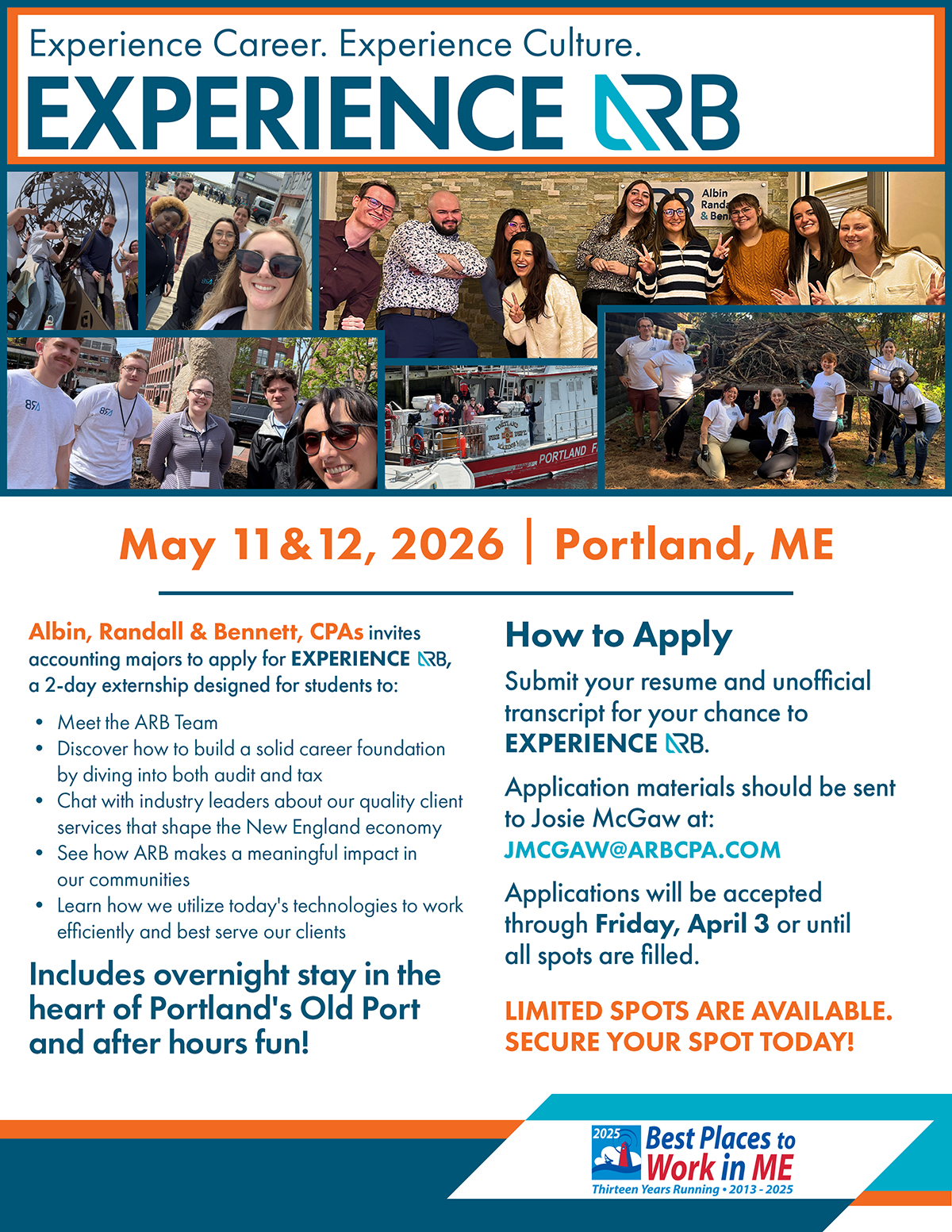 We understand career exploration during college is important, and we are here to help! Whether you’re attending our annual fall open house, participating in one of our intern/externships, or tuning in for a virtual meet & greet, we want to hear from you. Our management team is dedicated to coaching and mentoring young professionals to help establish and reach their career goals. We actively work with more than six of New England’s colleges and universities to help position graduates to excel in all areas of accounting. For information on any of our events, please see the links below or reach out to Cassidy Wood at cwood@arbcpa.com.